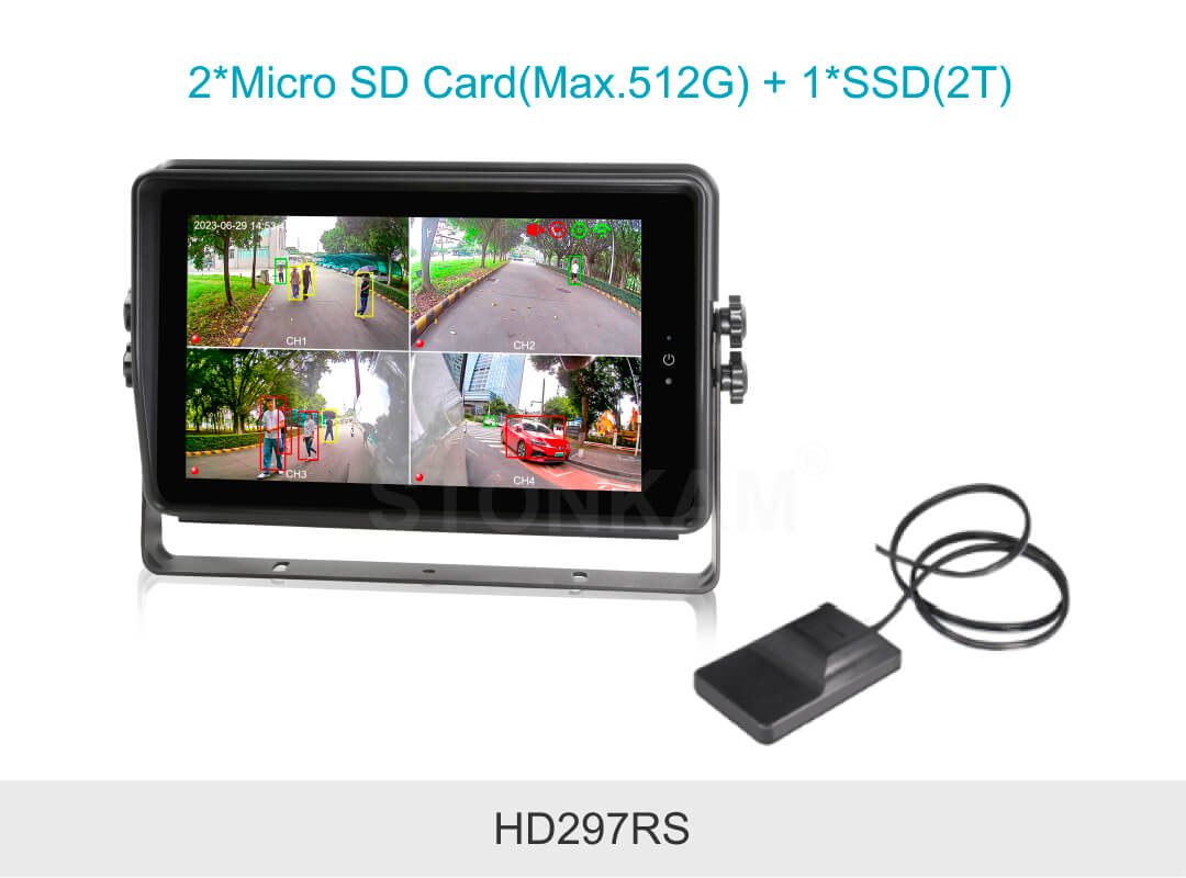 El monitor adopta la tecnología de aprendizaje profundo, integra algoritmo de detección y advertencia IA de peatones/vehículos en 4 canales, facilita la monitorización de 4 canales en la misma pantalla,360° sin punto ciego muerto;facilita la detección en tiempo real de peatones y vehículos alrededor del vehículo, para alertar rápidamente al conductor de posibles riesgos y evitar la colisión, mejorando a la seguridad en la conducción! Al mismo tiempo, este monitor tiene incorporado GPS/Wi-Fi/4G, facilita grabación de vídeo HD en tiempo real y grabación automática en bucle sin DVR adicional, con alta capacidad de almacenar, mejora la eficiencia y la seguridad de la gestión de flotas. Y es a prueba de agua a nivel IP66, puede funcionar normalmente en días de lluvia y nieve.