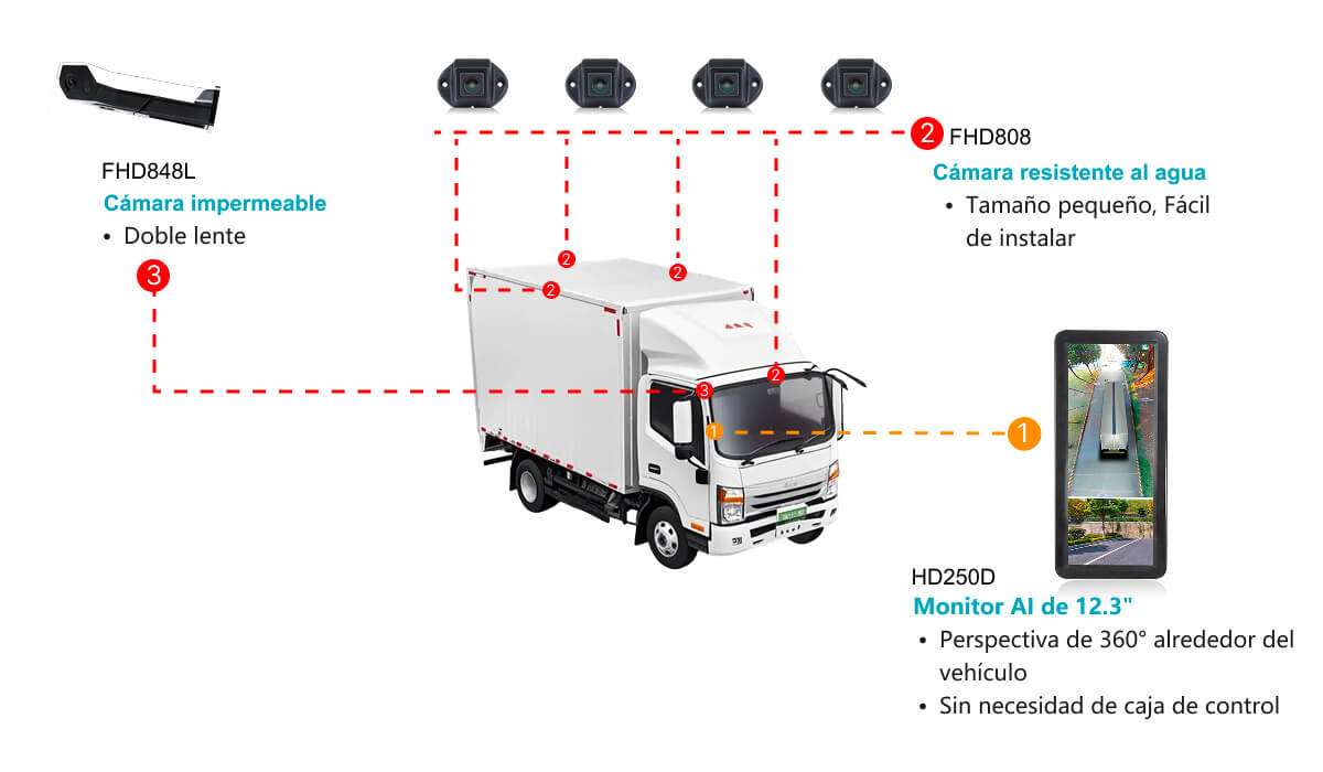 Las cámaras pueden conectarse a un monitor panorámico 360° y exportar mediante AHD/IPC/CVBS a MDVR o cámaras de dashcam existentes, logrando funcionalidad de IA 360° + MDVR. Además, permite la expansión de funciones de dashcam (DMS y ADAS) para satisfacer requisitos de aplicaciones en múltiples escenarios.